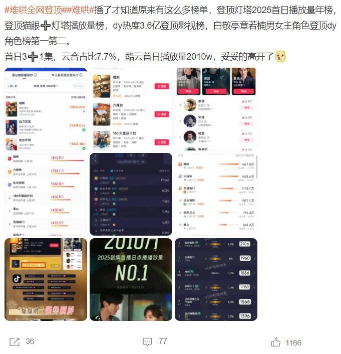 我们可以看到《难哄》登顶多个榜单,如:登顶2025年首日播放量年榜,登顶猫眼全网热度榜,登顶灯塔全网剧集播放量榜,登顶网剧播放指数榜,最关键的是,白敬亭和章若楠是角色榜单第一名和第二名,也就是说,《难哄》正在发酵中。